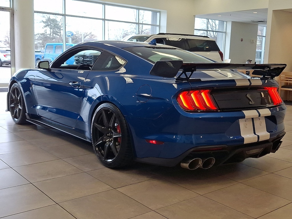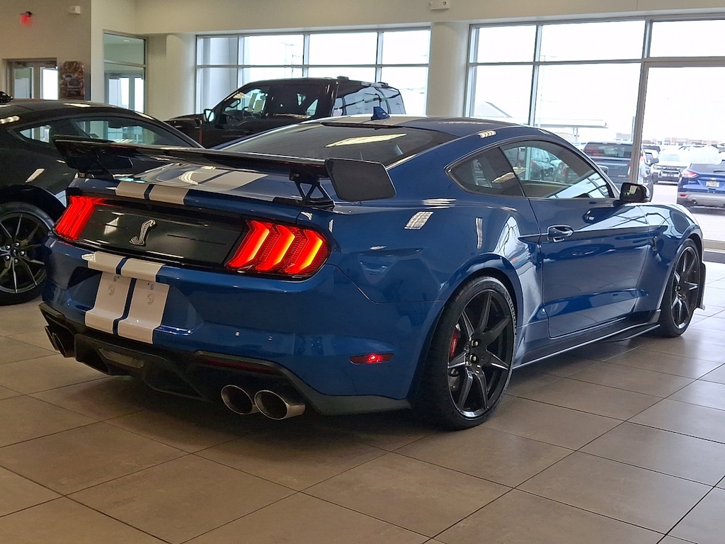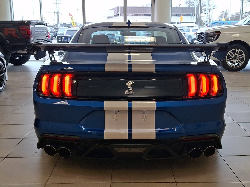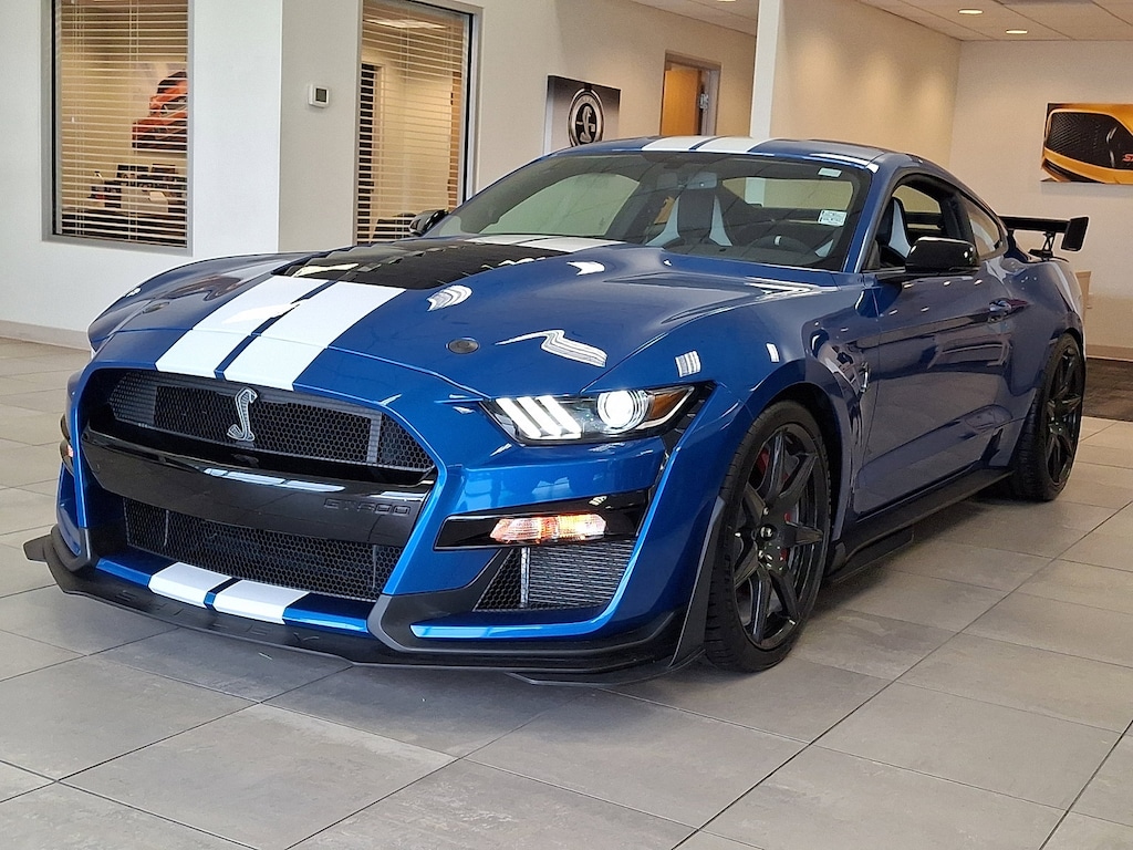 This Ford Mustang Shelby GT500 has a powerful Intercooled Supercharger Premium Unleaded V-8 5.2 L/315 engine powering this Automatic transmission. WHEELS: 20 EXPOSED CARBON FIBER, VELOCITY BLUE METALLIC, TECHNOLOGY PACKAGE -inc: BLIS (Blind Spot Information System), cross-traffic alert, Voice-Activated Touch-Screen Navigation System, pinch-to-zoom capability, SiriusXM Traffic and Travel Link, Radio: B&O Sound System by Bang & Olufsen, 12 speakers and subwoofer in trunk, Heated Mirrors, memory, turn signal and Cobra puddle lamps, RADIO: B&O SOUND SYSTEM BY BANG & OLUFSEN -inc: 12 speakers and subwoofer in trunk, PAINTED OVER-THE-TOP RACING STRIPES.